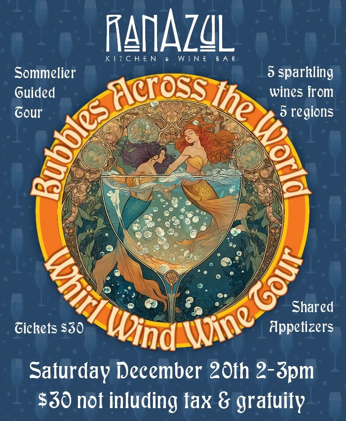 Join us for a sommelier guided wine tasting featuring a curated selection of 5 sparkling wines showcasing different regions and styles, paired with a delicious variety of appetizers. Saturday December 20th from 2:00 to 3:00 p.m. $30 per person not including tax and gratuity.